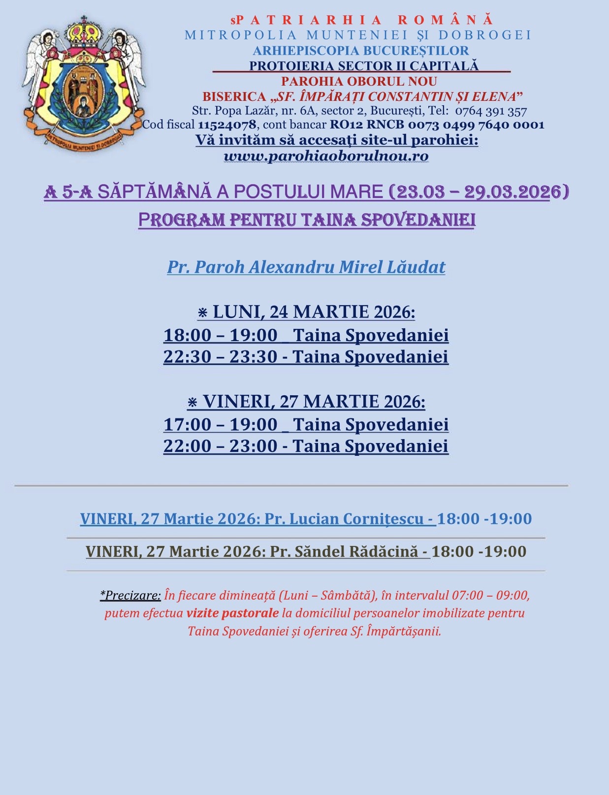 HomeUncategorizedProgram liturgic și program de spovedanie 23.03 – 29.03.2026 Mar. 22, 2026 at 6:47 pmUncategorizedProgram liturgic și program de spovedanie 23.03 – 29.03.2026March 22, 2026No tags Screenshot Screenshot share on Facebookshare on TwitterPatriarhia Română avertizează asupra fraudelor din mediul online care folosesc în mod abuziv numele BisericiiYou Might Also LikeProgram liturgic și program de spovedanie 11.08. – 17.08.2025Program LITURGIC 28.07. – 06.08.2025Program Liturgic – 26.05 – 01.06.2025PROGRAM LITURGIC – 19.08. – 25.08.2024UncategorizedBiserica se opune educației sexuale ideologizate și la vârste nepotrivite, spune Vasile BănescuUncategorizedSusţine biserica noastră! Redirecționează până la 3,5% din impozitul tău pe venit